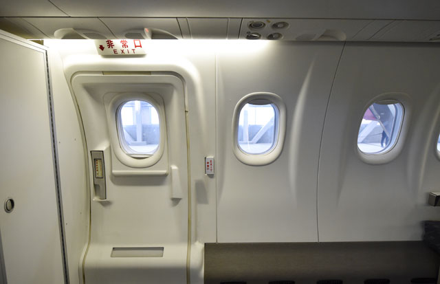 飛行検査機Q300の前方座席付近の非常口=5月16日 PHOTO: Tadayuki YOSHIKAWA/Aviation Wire