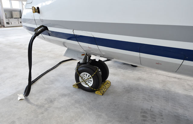 Q300の前脚。車止めには最後まで残ったYS-11Aの登録番号JA8709と書かれていた=5月16日 PHOTO: Tadayuki YOSHIKAWA/Aviation Wire