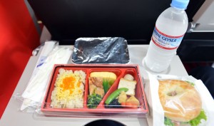 低コストキャリア(LCC)は、機内食など必要なサービスを乗客が自分で選ぶシステムで、WAJも機内食は有料だ。フライトアテンダントのお披露目後、機内で試食用機内食が報道陣に用意された。(新塗装機の記事はこちら)