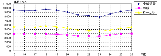 2003年度(平成15年度)から14年度(26年度)までの国内線旅客数の推移(国交省航空輸送統計から)