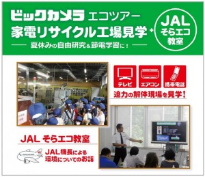 ツアーでは、ビックカメラのグループ企業の家電リサイクル工場で、テレビやエアコンの解体現場を見学。JALは、高度1万メートルから見た地球環境の変化をJALの機長と学ぶ「そらエコ教室」を開く。