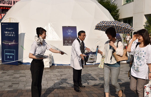 また、松石禎己社長や客室乗務員、北九州の本社や羽田空港から駆けつけた社員ら総勢20人ほどが、うちわの入ったパンフレットを有楽町を行き交う人たちに配った。