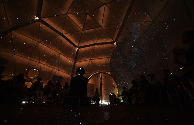 ドーム状の移動式プラネタリウムを設置し、10日午後4時から午後8時まで1時間ずつ計5回上映している。1回の上映あたりの定員は約50人で、午後4時からの初回はほぼ満席となった。