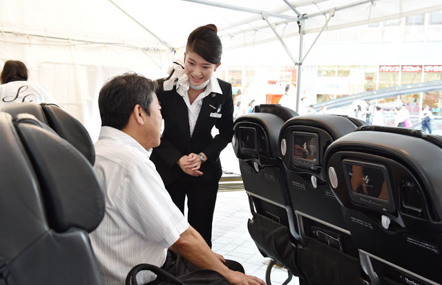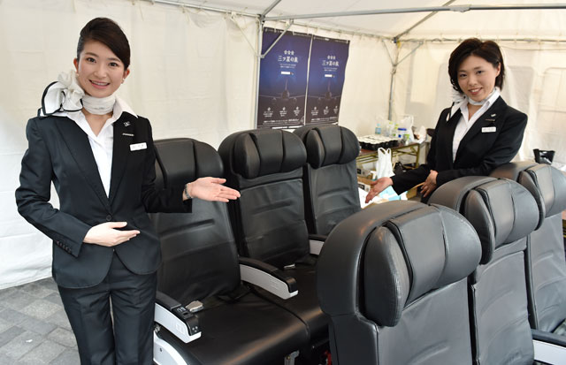 会場には、同社のA320に使用している革張りシートも展示。足もとのゆとりや座り心地などをアピールし、首都圏での認知度向上や利用者層拡大を図る。都内でのイベントは、昨年渋谷の東急プラザで開いて以来となった。