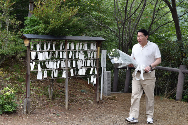 御巣鷹山の「昇魂之碑」に献花するJALの植木社長=8月12日午後1時半すぎ PHOTO: Tadayuki YOSHIKAWA/Aviation Wire
