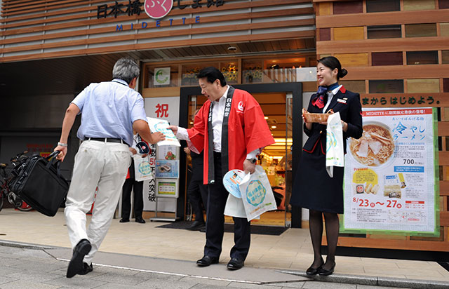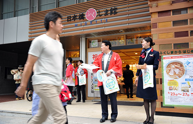 日本航空(JAL/JL、9201)は8月25日、東京・日本橋の日本橋ふくしま館「MIDETTE(ミデッテ)」前で、植木義晴社長や福島県出身の客室乗務員(CA)などが同県の観光パンフレットを配り、旬のフルーツなどをピーアールした。