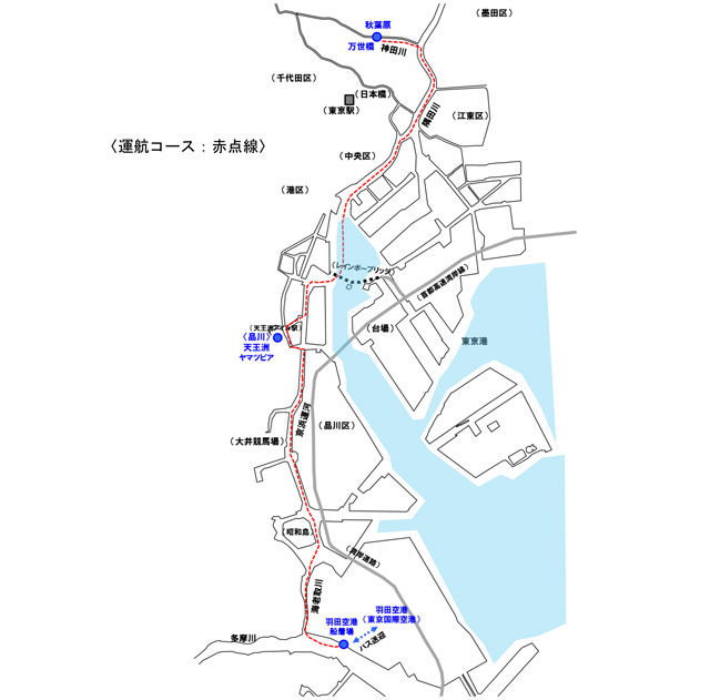・羽田空港(11:15発)→海老取川→京浜運河→品川→隅田川→神田川→秋葉原(14:00着)