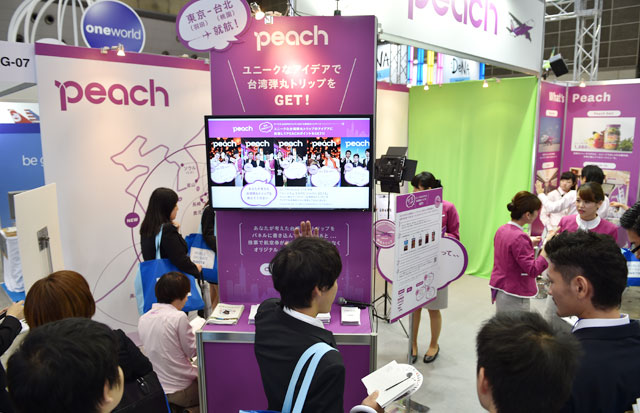 日本航空(JAL/JL、9201)や全日本空輸(ANA/NH)をはじめ、内外の航空会社10社も出展。LCCはジェットスターグループ、ピーチ・アビエーション(APJ/MM)、春秋グループがブースを設けた。JALのブースではシートの展示のほか、江戸時代の日本をモチーフにしたメモ帳が配られ、ピーチは8月に就航した羽田-台湾線の航空券購入などに使えるポイントが当たるイベントを開催していた。