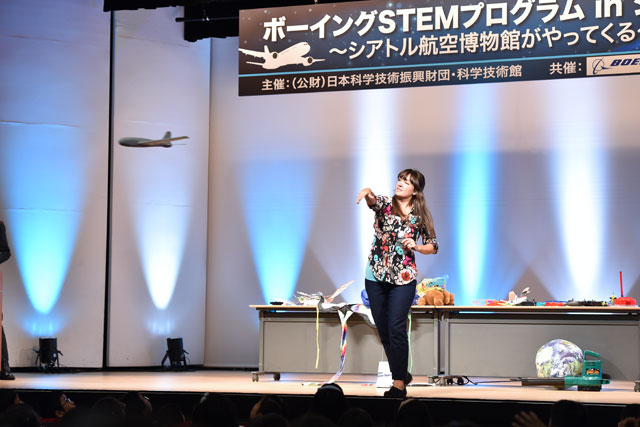 サラさんが会場から実験の参加者を募ると、多くの子供たちが立候補。壇上に上がった子供たちが、実験用の模型飛行機や気球、プロペラ、ロケットなどをサラさんの説明に合わせて飛ばすと、会場内からは歓声がわき起こった。子供たちはサラさんの質問にも先を競って手を挙げ、大人顔負けの知識を披露していた。
