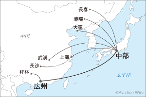 同社の冬ダイヤからの中部発着便は上海が週7往復、大連が週4往復、瀋陽が週4往復、長春が週2往復、武漢が週3往復。夏ダイヤと比較すると、大連が週3往復、瀋陽と武漢がそれぞれ週1往復ずつ減便となる。週2往復で運航していた鄭州便は8月22日に運休した。