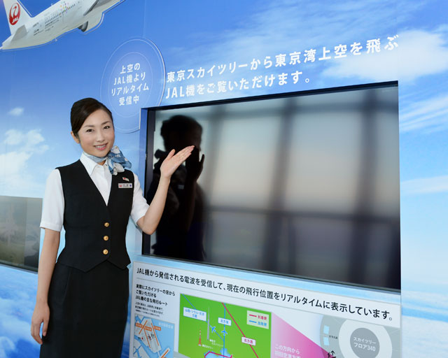 お盆が終わり学校の夏休みも終わりが近づいてきた。日本航空(JAL)は東京スカイツリーの天望デッキで羽田空港に離着陸するJAL機の便名などをリアルタイム表示する「JAL機リアルタイム位置表示サービス」を展示している。8月26日まで。