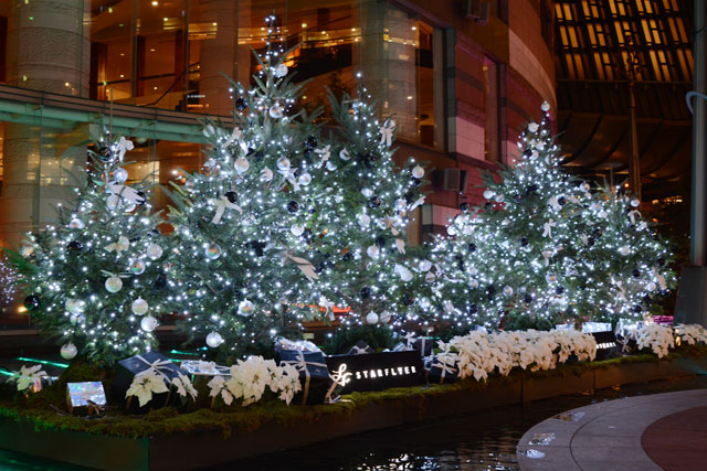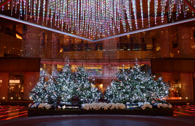 キャナルシティ博多でも、地下1階サンプラザステージに、スターフライヤーカラーのクリスマスツリーを12月25日まで設置している。