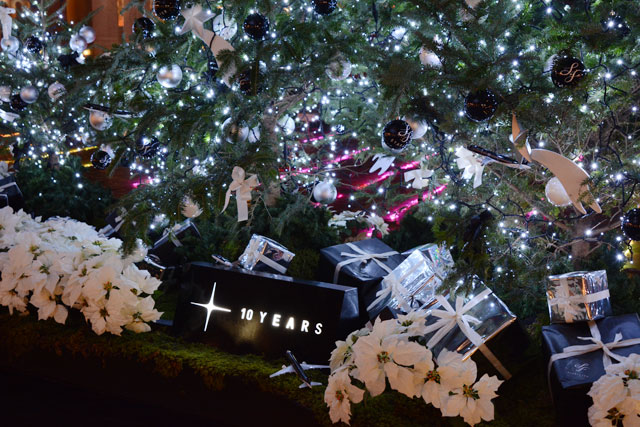 スターフライヤー就航10周年ロゴの飾りを付けたキャナルシティ博多のクリスマスツリー(同社提供)