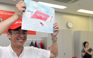 プレゼントされた絵を掲げるエアアジア・ジャパンの岩片社長=8月27日 PHOTO: Tadayuki YOSHIKAWA/Aviation Wire