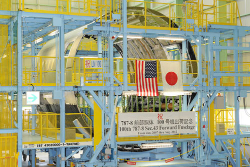川崎重工は2005年5月から787の開発と量産事業に参画し、前部胴体と主脚格納部、主翼固定後縁を担当。同社が担当する胴体構造部位では、民間旅客機では世界で初めて複合材製の一体成形構造が採用されている。