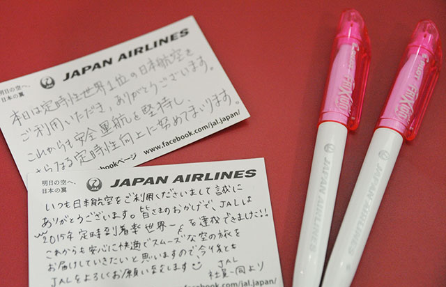 利用客にプレゼントしたメッセージカードとボールペン=16年2月1日 PHOTO: Yusuke KOHASE/Aviation Wire