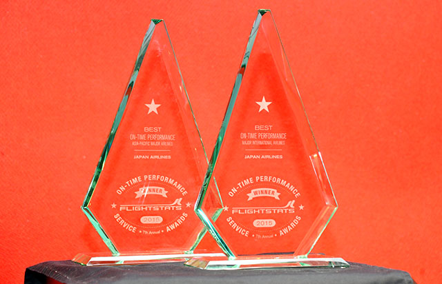 JALの2015年の定時到着率は89.44%。全世界の航空会社を対象とした「Major International Airlines(主要国際航空会社部門)」と、米国を除いたアジア太平洋地域の航空会社を対象とした「Asia-Pacific Major Airlines(アジア・パシフィック主要航空会社部門)」で首位を獲得した。航空連合を対象とした「Airlines Alliances(アライアンス部門)」は、JALが所属する航空連合、ワンワールド・アライアンスが80.97%で1位を獲得した。
