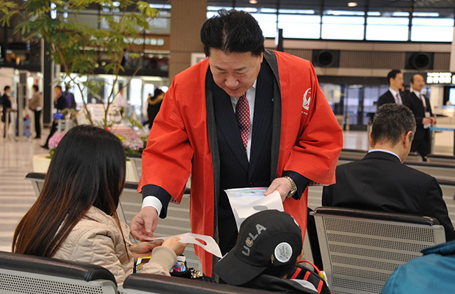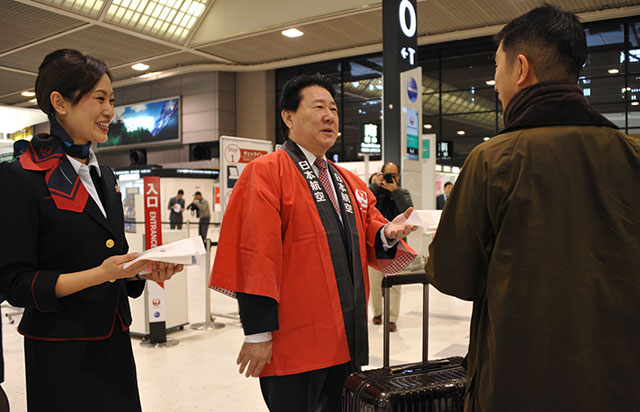 利用客にプレゼントを配る植木社長=16年2月1日 PHOTO: Yusuke KOHASE/Aviation Wire