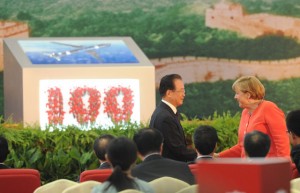 中国・天津で行われた記念式典で握手を交わす温家宝首相(左)とアンゲラ・メルケル首相(Airbus提供)