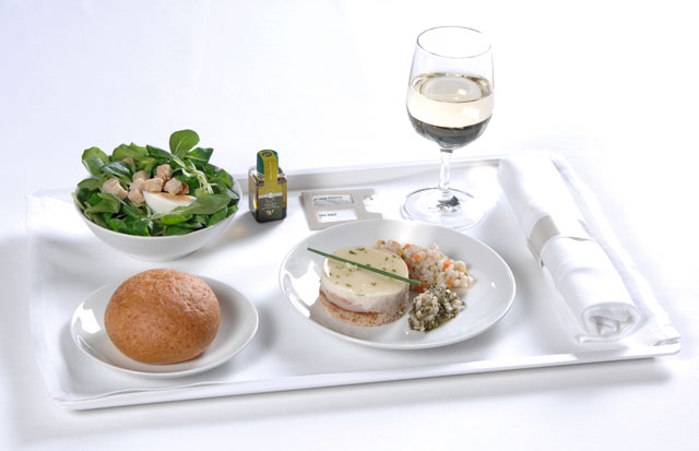 ファーストクラスの新メニューでは、ロブスターのキャロットムース添えや、若鶏とウズラのルーラード(薄く切った肉を、ロール状に巻いた料理)などを用意した。
