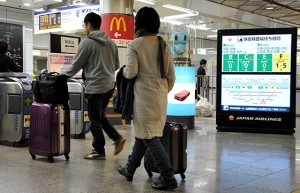 羽田空港第1ビル駅改札内に設置した大型モニター=16年4月1日 PHOTO: Yusuke KOHASE/Aviation Wire