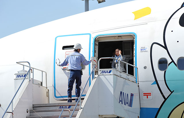 NH462便のドアを開けるANAのグランドハンドリングスタッフ(左)=16年4月15日 PHOTO: Yusuke KOHASE/Aviation Wire