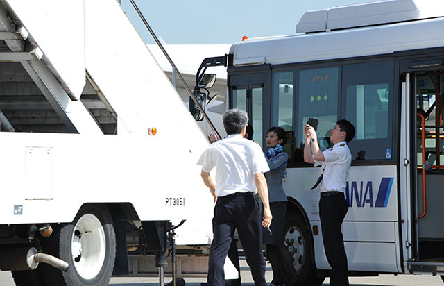 ピース★ジェットを撮影するNH462便のCA(中)と運航乗務員=16年4月15日 PHOTO: Yusuke KOHASE/Aviation Wire