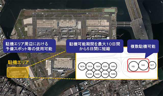 駐機期間を短縮し、駐機場ごとの稼働率を高める。最大10日間から5日間にすることで、受入体制を強化。また、大型機に対応する駐機場を分割することで、複数を駐機できるようにする。