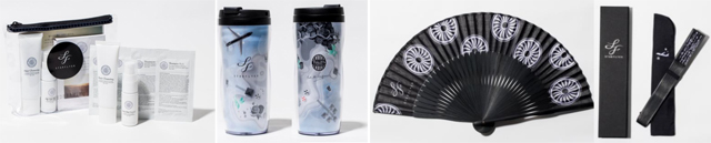 スターフライヤーが機内販売する(左から)トラベルヘアケアセット、タリーズのルタンブラー、かまわぬの扇子(同社提供)