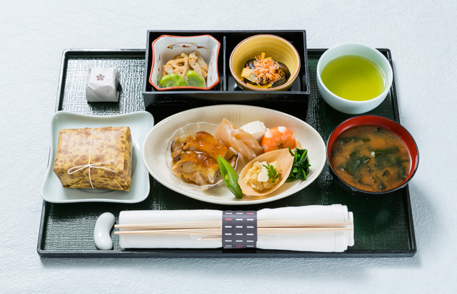 5月上旬は、「媛っこ地鶏」照焼き伊予柑風味、中旬はみかん果皮を配合したエサで育った真鯛「みかん愛たい」と皐月(さつき)の野菜炒め、下旬はみかんジュース粕が配合されたエサで育つ「ふれ愛・媛ポーク」の塩蒸しなど、地元の味を提供。俵ごはんは県産のコシヒカリを使用する。