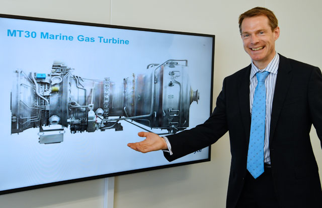 MT30を紹介するロールス・ロイス艦艇部門アジア環太平洋担当のヴァイス・プレジデント、ウィル・エリス氏=16年4月 PHOTO: Tadayuki YOSHIKAWA/Aviation Wire