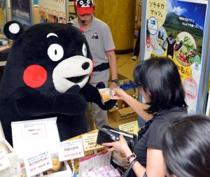 買い物客にポーズを取るくまモン=9月24日 PHOTO: Tadayuki YOSHIKAWA/Aviation Wire