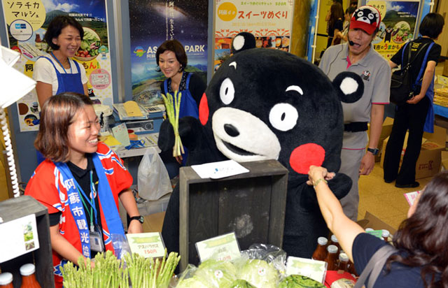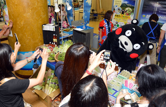 また、昨年のゆるキャラグランプリで1位を獲得した熊本県のイメージキャラクター「くまモン」と、阿蘇市の「あか牛くん」が会場に登場。県の営業部長であるくまモンは、ジャンプを交えたくまモン体操で会場をわかせた後、自ら店頭で接客して売り上げアップに貢献していた。