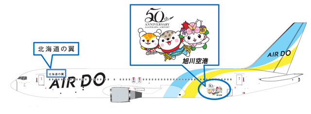 旭川空港は1966年6月30日、旭川市と東神楽町にまたがる丘陵地帯に開港。ボーイング767-300型機(1クラス286席)に、開港50周年ロゴや旭川市のシンボルキャラクター 「あさっぴー」と「ゆっきりん」、東神楽町のマスコットキャラクター「かぐらっき~」をラッピングで描く。また、エア・ドゥの企業理念「北海道の翼」を、機体前方に初めて表記する。