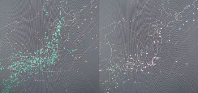 16年6月2日正午ごろの日本上空の飛行状況。左が全国、右図のうち桃色が羽田行き、青色が成田行きを示す(国交省の資料から)