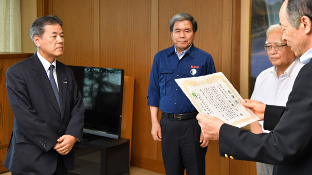 阿蘇草原再生協議会の高橋会長(右)から感謝状を渡されるソラシドの髙橋社長=16年7月25日 PHOTO: Tadayuki YOSHIKAWA/Aviation Wire