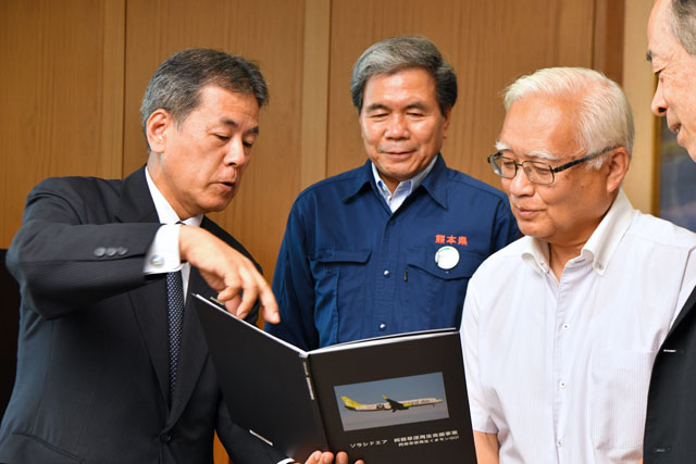 阿蘇草原再生くまモンGO!の写真を収めたフォトブックを手にして蒲島知事(左から2人目)らに説明するソラシドの髙橋社長(左)=16年7月25日 PHOTO: Tadayuki YOSHIKAWA/Aviation Wire