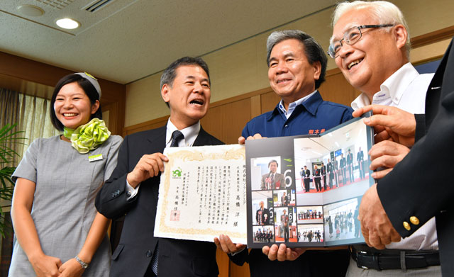 感謝状とフォトブックを手にするソラシドの髙橋社長(左から2人目)と蒲島知事(同3人目)ら=16年7月25日 PHOTO: Tadayuki YOSHIKAWA/Aviation Wire