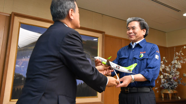 蒲島知事(右)に「がんばるけん!くまモンGO」の模型を手渡すソラシドの髙橋社長=16年7月25日 PHOTO: Tadayuki YOSHIKAWA/Aviation Wire