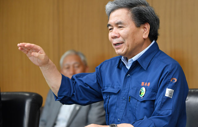 蒲島知事は、4月に発生した熊本地震について「歴史的に珍しく、28時間以内に阪神淡路大震災級の地震が2回起きた。これは対応をとても難しくしている。もう一つは1900回という、異常な長さの余震が続いており、なかなか終わりが見えない」と、地震発生から3カ月経った現状を語った。