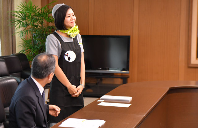 「がんばるけん!くまモンGO」で着用するオリジナルエプロンを蒲島知事らに披露する客室乗務員の甲斐さん=16年7月25日 PHOTO: Tadayuki YOSHIKAWA/Aviation Wire