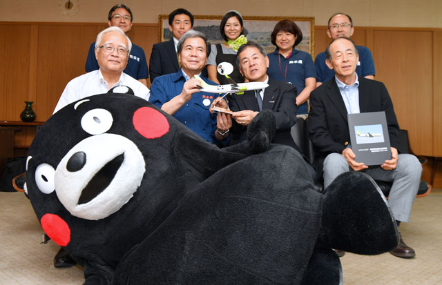 くまモンとともに記念撮影に応じる蒲島知事とソラシドの髙橋社長(前列中央)ら=16年7月25日 PHOTO: Tadayuki YOSHIKAWA/Aviation Wire