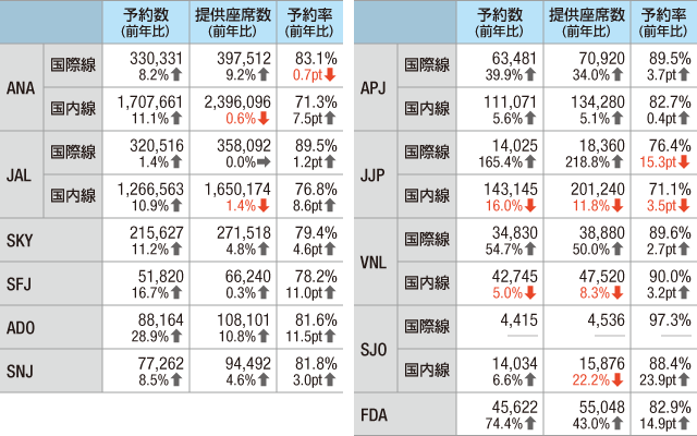 予約数を見ると、国際線はLCCを含め各社とも前年を上回り、特にLCC各社は大幅に上回っている。国内線はフルサービス航空会社(FSC)では前年を大きく上回っているが、LCCでは大きく下回っているところも目立った。