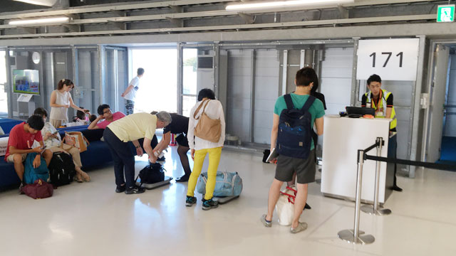 搭乗口前で行われる機内持込手荷物の重量検査=16年8月14日 PHOTO: Tadayuki YOSHIKAWA/Aviation Wire