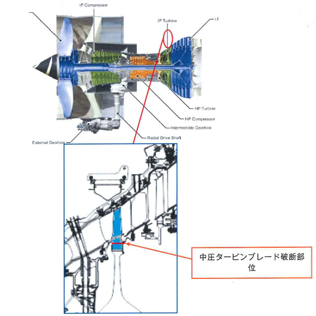 ブレードが破断した中圧タービンは、ファンから送られた約1.5気圧の圧縮空気を、約10気圧に昇圧する中圧圧縮機を回すもので、ここで圧縮された空気は、さらに高圧圧縮機で40気圧以上に昇圧される。この圧縮空気に燃焼器で燃料を混合して燃やし、燃焼ガスを発生させてタービンを回して787を飛ばしている。