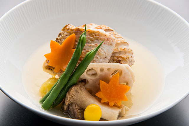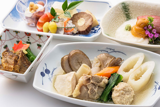 日本発の欧米とシンガポール行きファーストクラスでは、島根県産のアマダイをアワビのソテーを添えて提供する。ソースには春菊のピューレを使用した。日本発欧米線の一部便ファーストクラスでは、比内地鶏を使用した玉子丼を用意する。